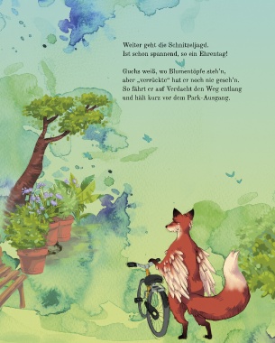 Weiter geht die Schnitzeljagd. Ist schon spannend, so ein Ehrentag! Guchs weiß, wo Blumentöpfe steh’n, aber „verrückte“ hat er noch nie geseh’n. So fährt er auf Verdacht den Weg entlang und hält kurz vor dem Park-Ausgang.